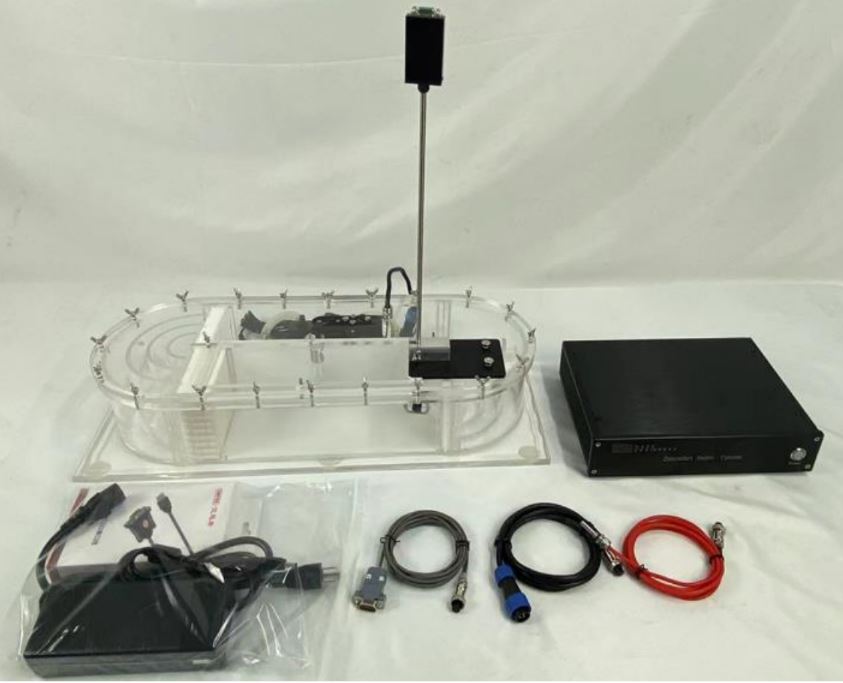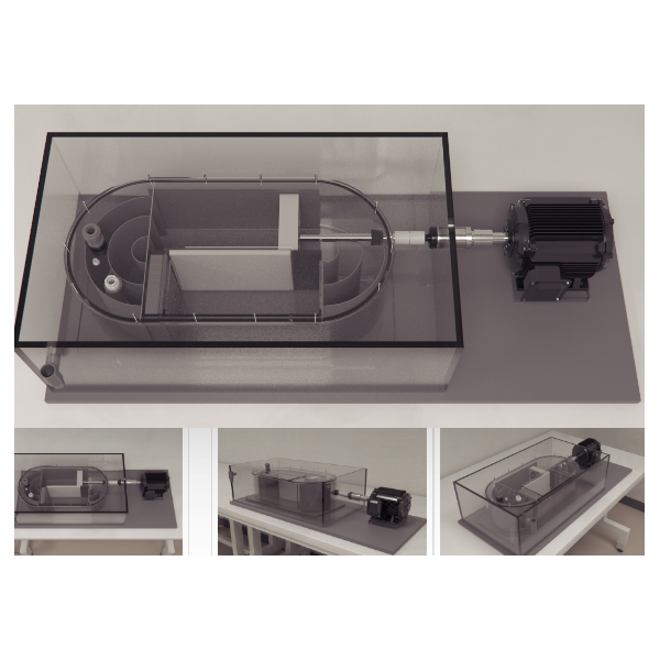 Im Inneren des Tanks befindet sich ein transparenter, tunnelförmiger Testbereich (30 cm Länge, 10 cm Breite und 10 cm Höhe), der mit einem Propeller ausgestattet ist, der an einen Wechselstrommotor sowie einen elektronischen Controller angeschlossen ist. Der elektronische Controller regelt die Fließgeschwindigkeit des Wassers.