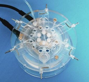 The chamber is constructed from clear acrylic having a diameter of 130 mm, overall height is 70 mm and the base plate is 130 mm in diameter. The slices rest on a nylon net held in place by a close fitting removable insert. Pre-oxygenated medium enters the main body of the chamber through a fine bore tube which spirals in the heated distilled water in the lower part of the chamber and enters the upper part of the chamber directly into the feed for each of the six chambers. Depending on whether submerged or interface type preparations are required, the height of the perfusion fluid is adjusted at the exit well by means of a variable angle stainless steel needle as with our MS-1 chambers. In the case of interface preparations, the high oxygen tension is maintained by bubbling a 95% oxygen, 5% carbon dioxide gas mixture through a sintered bubbler located in the lower heated part of the chamber. This moistened and warmed gas mixture enters the upper part of the chamber via "port holes" and is then deflected by a standard rectangular glass coverslip across the centrally located slice preparation. The temperature in the upper chamber is maintained by ensuring that the medium and moistened gas mixture enter at the required temperature. This is dependent on the temperature of the lower chamber body which is warmed by a heating element controlled by thePTC03
